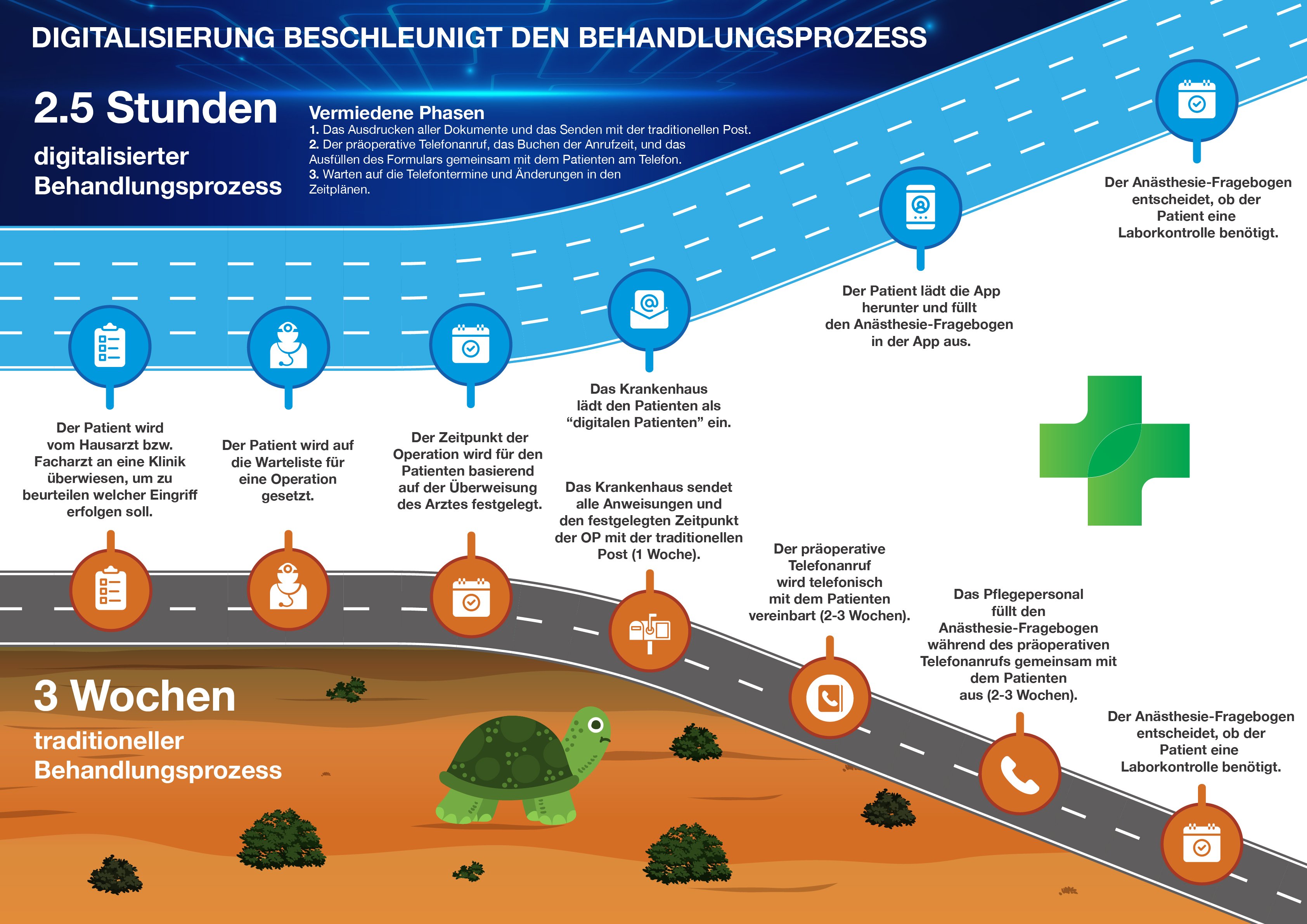 Im Gegensatz dazu wird der gleiche Prozess bei Anwendung eines digitalen chirurgischen Behandlungspfades auf etwa 2 ½ Stunden reduziert. Die Gründe hierfür sind, dass die meisten Schritte automatisiert werden und keine Telefonanrufe oder das Versenden von Fragebögen und Informationen mit der Post erforderlich ist. Solch ein beschleunigter Behandlungspfad kann besonders hilfreich bei der Vorbereitung eines neuen Patienten auf eine Operation sein, wenn spät eine Absage von dem eigentlichen Patienten bekannt wird.