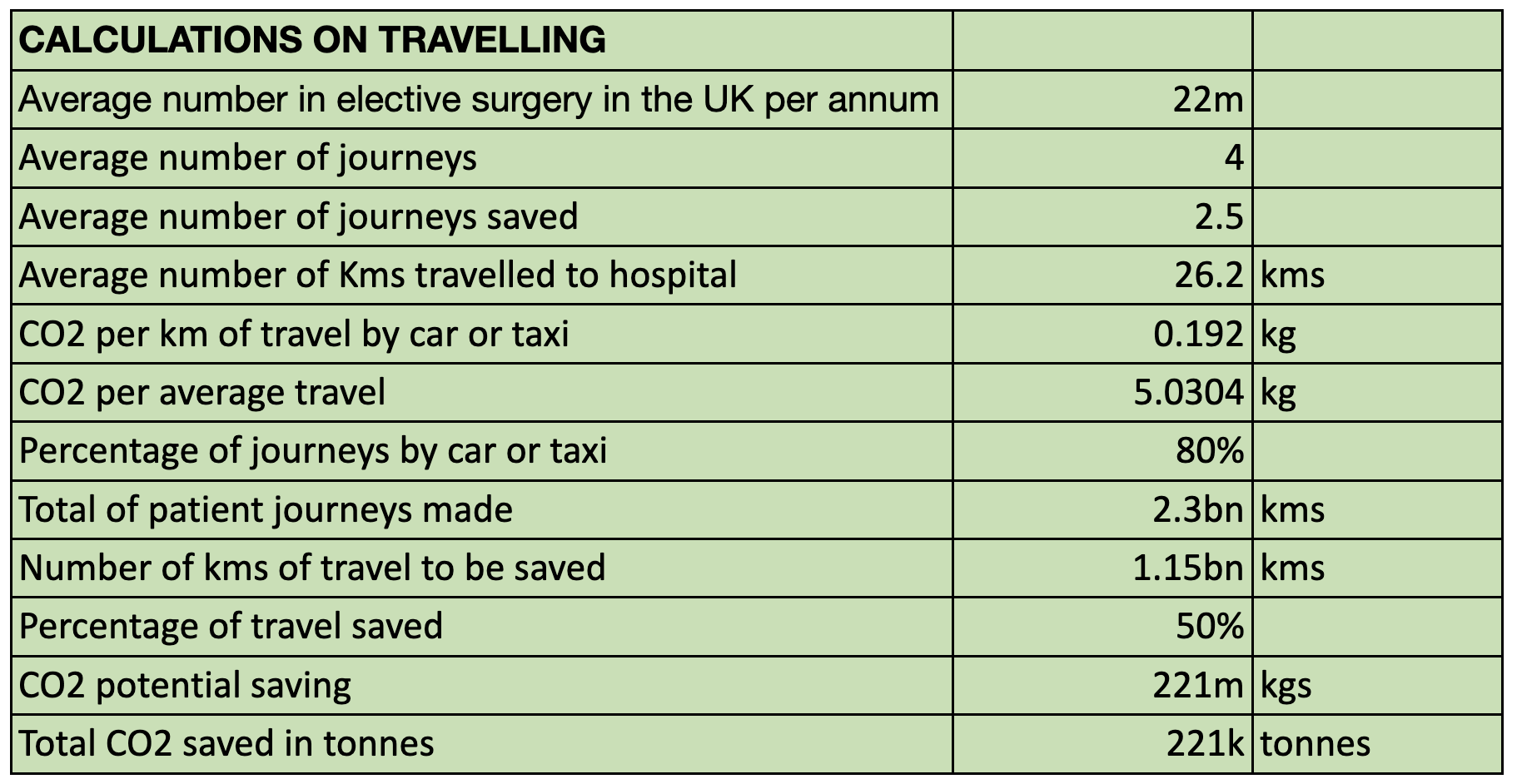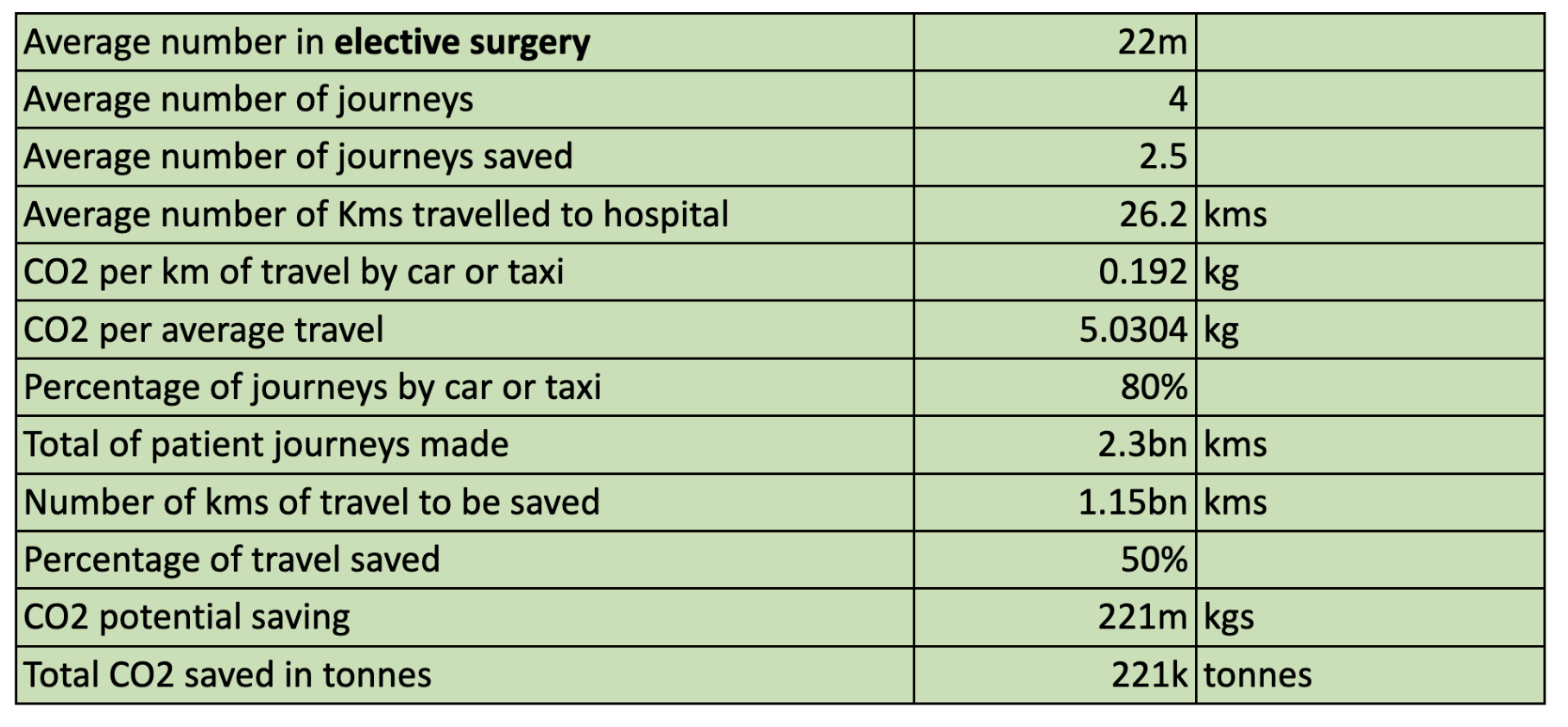 It would mean the patient travel associated with elective surgery, therefore, could account for as much as 5% of the carbon footprint of the NHS. Based on this insight, an understanding of the CO2 emissions per kilometre by car or taxi is 0.192 kgs, and an average of 26.2km per hospital appointment, which means that the CO2 emissions are 5.03kg per trip.