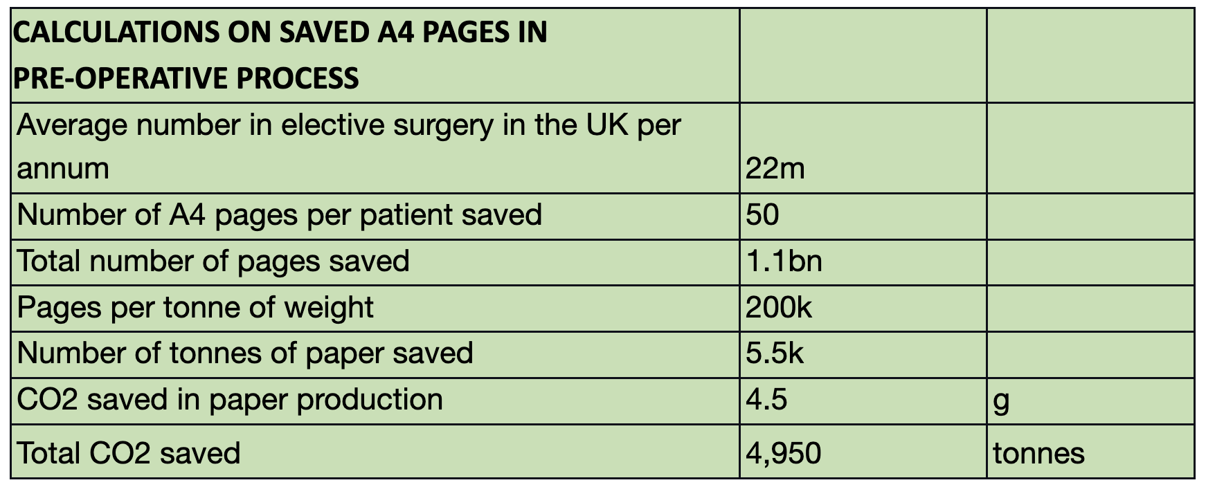 Our calculations demonstrate that if all of the elective surgery patients in the UK (22 million) are printed 50 A4 pages per patient, only in the preoperative phase, that would be in total 1,1bn pages of printed paper. If using the most commonly used paper type of 80gsm computer printing paper, the total would be 200,000, and the number of tonnes of paper saved would be 5,500. That would result in 4.5g C02 savings in paper production, per A4 page, for a total of 4,950 tonnes of CO2 saved.