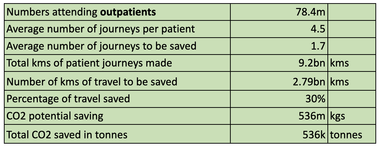 Again, if the average travelling kilometres from home to hospital is 25km and all of the 78.4 million outpatients travel to the hospital and home 4 times, it means 8.8bn kms will be travelled annually. With the 30% reduction in the patients’ travelling reductions, the travelled kilometres would decrease by 2.79 billion kilometres. That would lead to CO2 potential savings of 536k tonnes of savings on carbon dioxide (CO2) emissions.