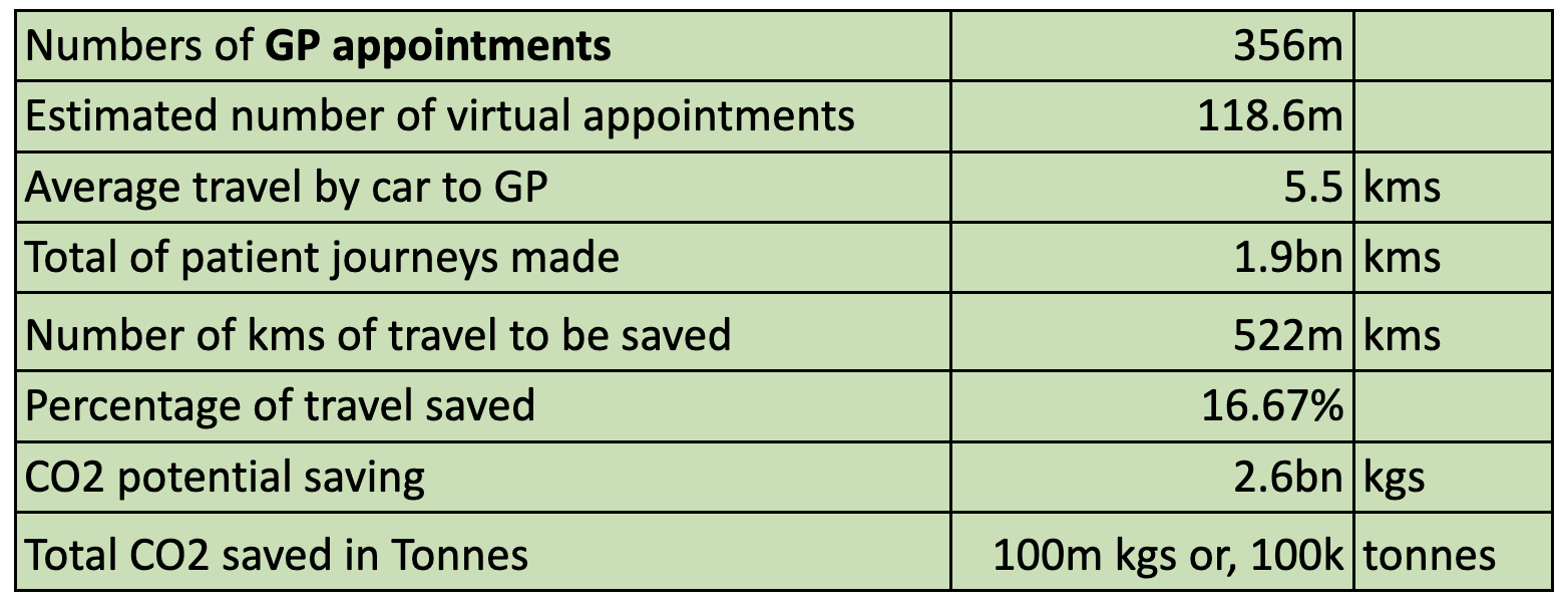 The potential reductions show a possible total of 1.1bn kilometres saved in travel. This includes the calculation where 80% of the journeys are by car or taxi (excluding public or patient transport services). Furthermore, it means 221,337,600 kgs of savings and, in total, 211,338 tonnes of savings on carbon dioxide (CO2) emissions.